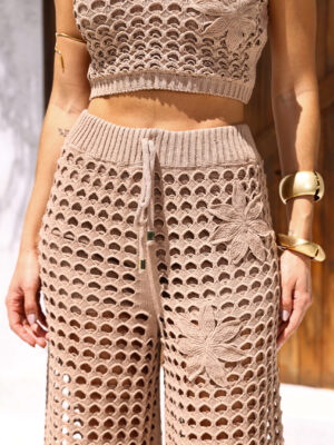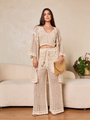 A calça de cintura alta possui modelagem reta levemente ampla, acompanhada de cós com elástico embutido e amarração funcional. Consequentemente, garante um caimento alinhado com leve fluidez e equilíbrio perfeito. Em suma, é um conjunto sofisticado, moderno e impactante, que transita facilmente com forte referência ao tricot europeu contemporâneo.