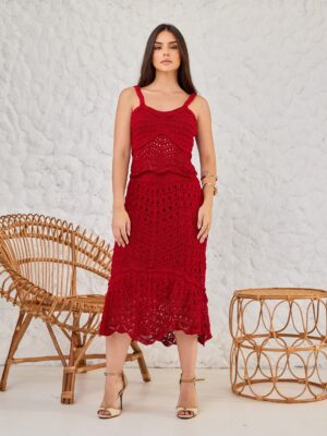 A calça pantalona possui modelagem ampla e reta, acompanhada de tramas em faixas horizontais e vazados discretos. Consequentemente, garante liberdade de movimento, fluidez e um caimento estruturado perfeito. Em suma, é um conjunto sofisticado, imponente e funcional, que transita facilmente entre produções resort chic e looks executivos modernos.