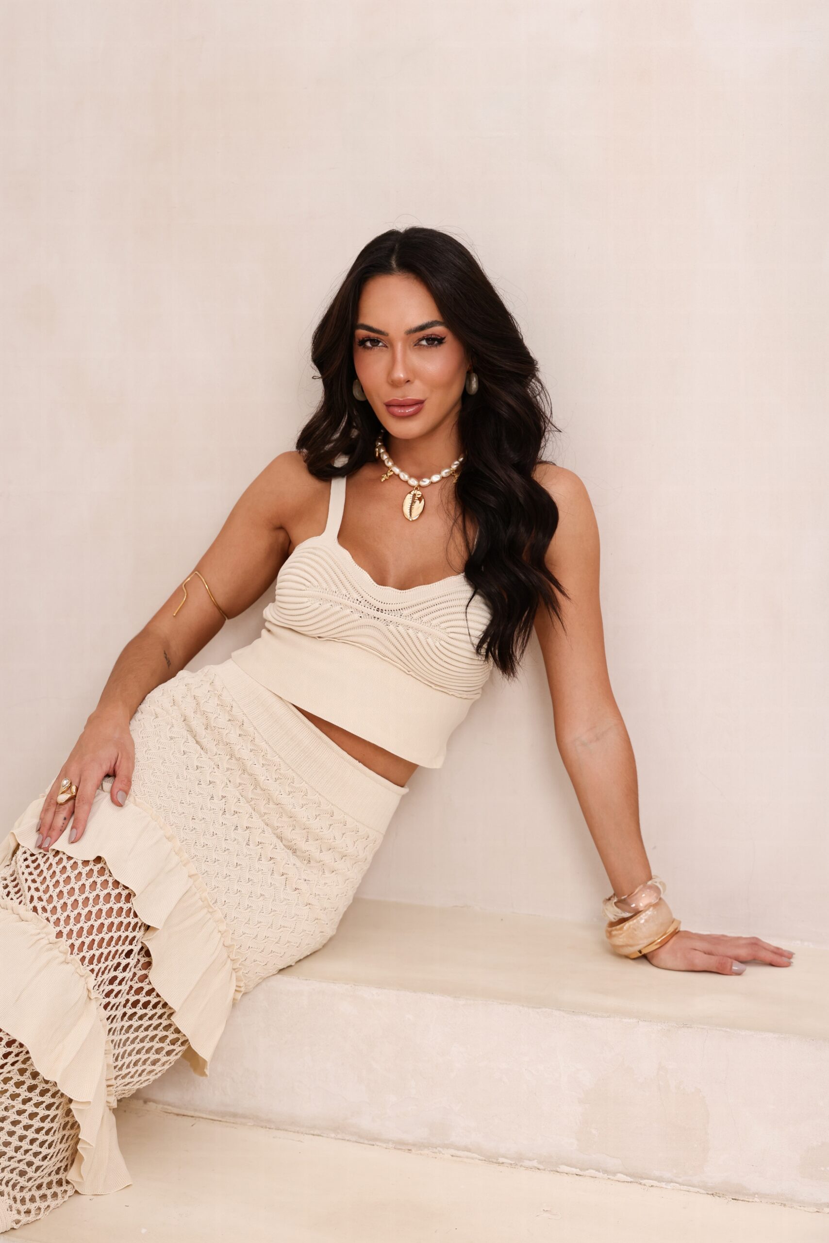 A saia apresenta detalhes de babado estrategicamente posicionados. Por isso, cria fluidez e feminilidade ao caminhar. Além disso, a trama vazada adiciona leveza e charme ao visual. Enquanto isso, o top complementa o conjunto com um design delicado e estruturado. Consequentemente, proporciona o equilíbrio perfeito entre modernidade e elegância.