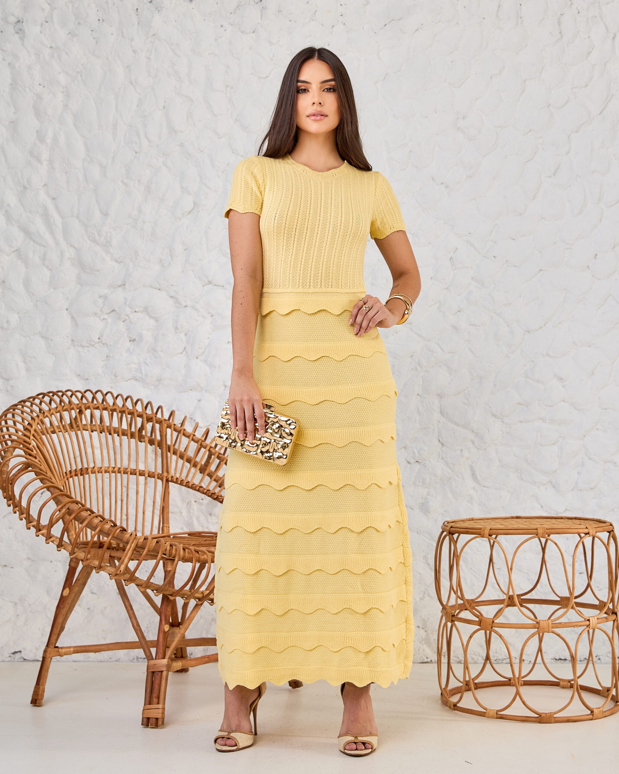Os detalhes em babado adicionam charme e feminilidade à peça. Por outro lado, o tricot bem estruturado assegura caimento impecável e acabamento sofisticado. Em suma, é um vestido atemporal, pensado para mulheres que valorizam conforto, estilo e elegância em cada detalhe.
