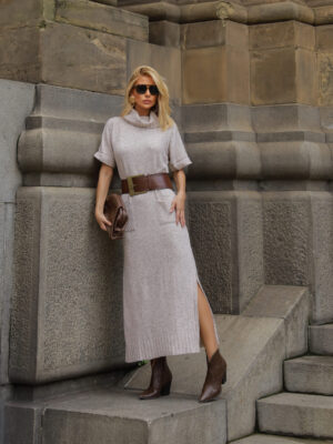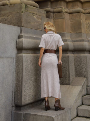 O vestido possui modelagem ajustada ao corpo com comprimento midi alongado, acompanhado de mangas longas e uma discreta fenda lateral. Consequentemente, garante um caimento alinhado sem marcar excessivamente, proporcionando mobilidade e feminilidade. Em suma, é um vestido estruturado, bonito e funcional, que transita facilmente entre compromissos profissionais e jantares noturnos.